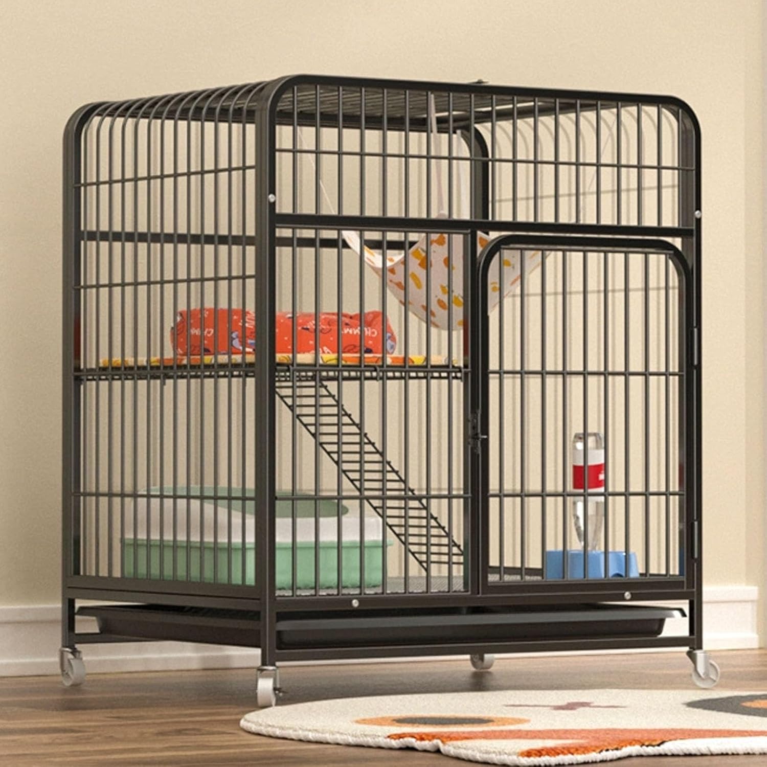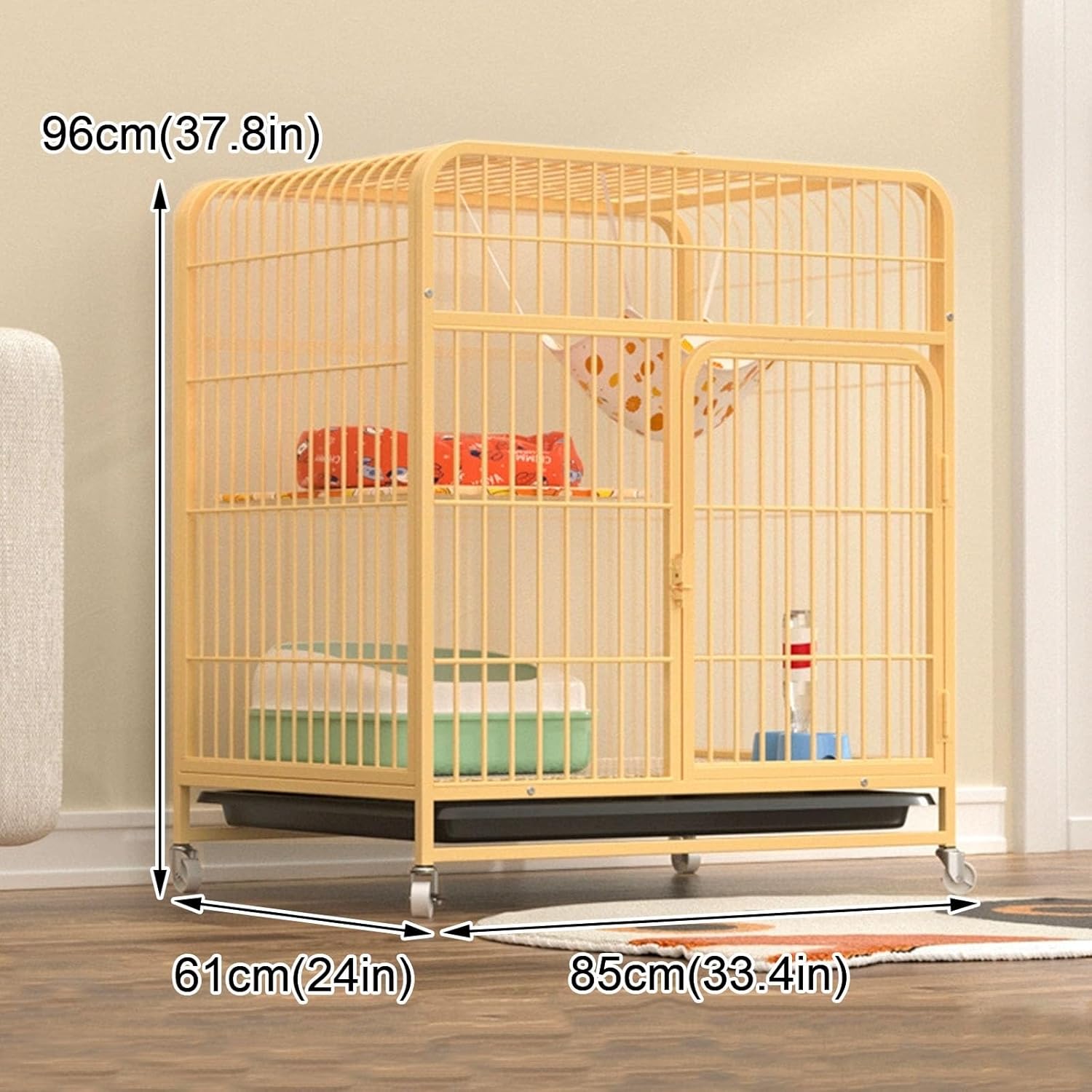 Please confirm or compare the sizes carefully before making your purchase. Thank you.Product Name: Large DIY Cat Enclosures - Metal Wire Indoor Cat Crate PlaypenMaterial: MetalPackage Contents: - Cat Cage- Hammock- Straps- Foot Pad- Cat Bed- Cat Teaser- Tray- Wheels- Platform LadderWarm Prompt: Please double-check the size before purchasing! Note: Due to manual measurement, there may be a 1-2 cm error.