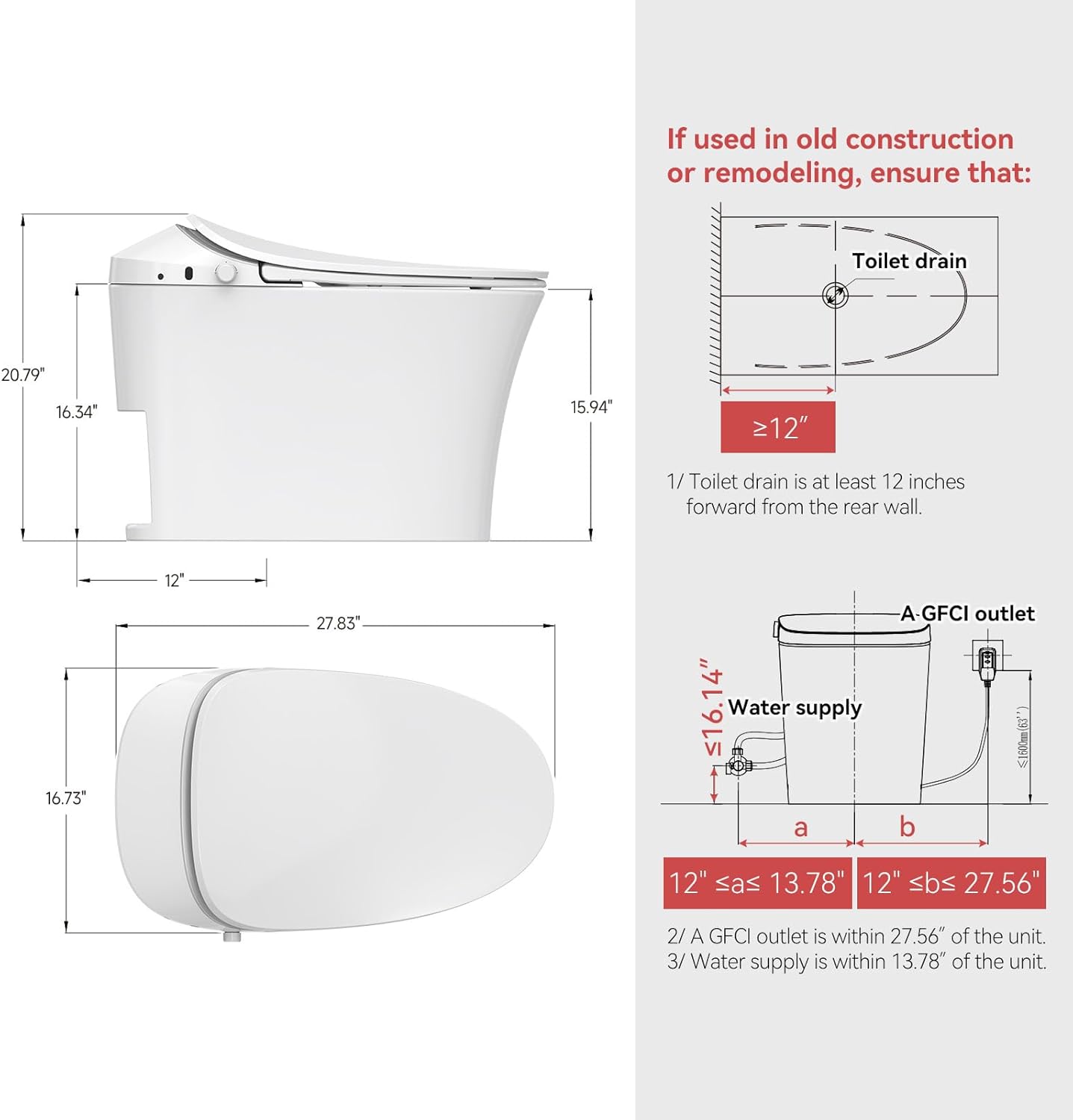 | Included Components | Main Unit-Smart Toilet, Sealing Wax Ring,Flange,Three Way Angle Valve,Mounting Kits, Remote Control, Installation Cardboard,User Manual |